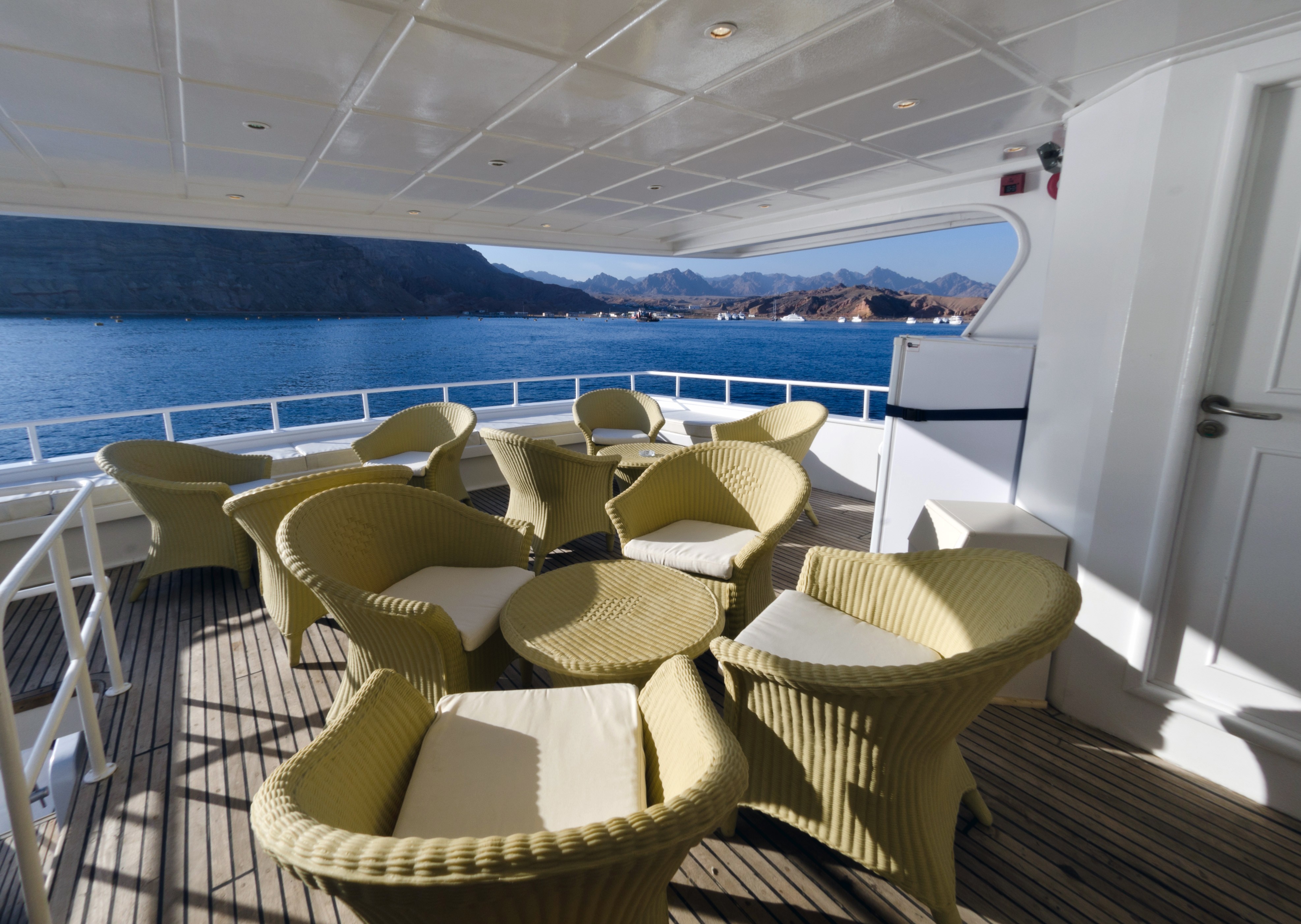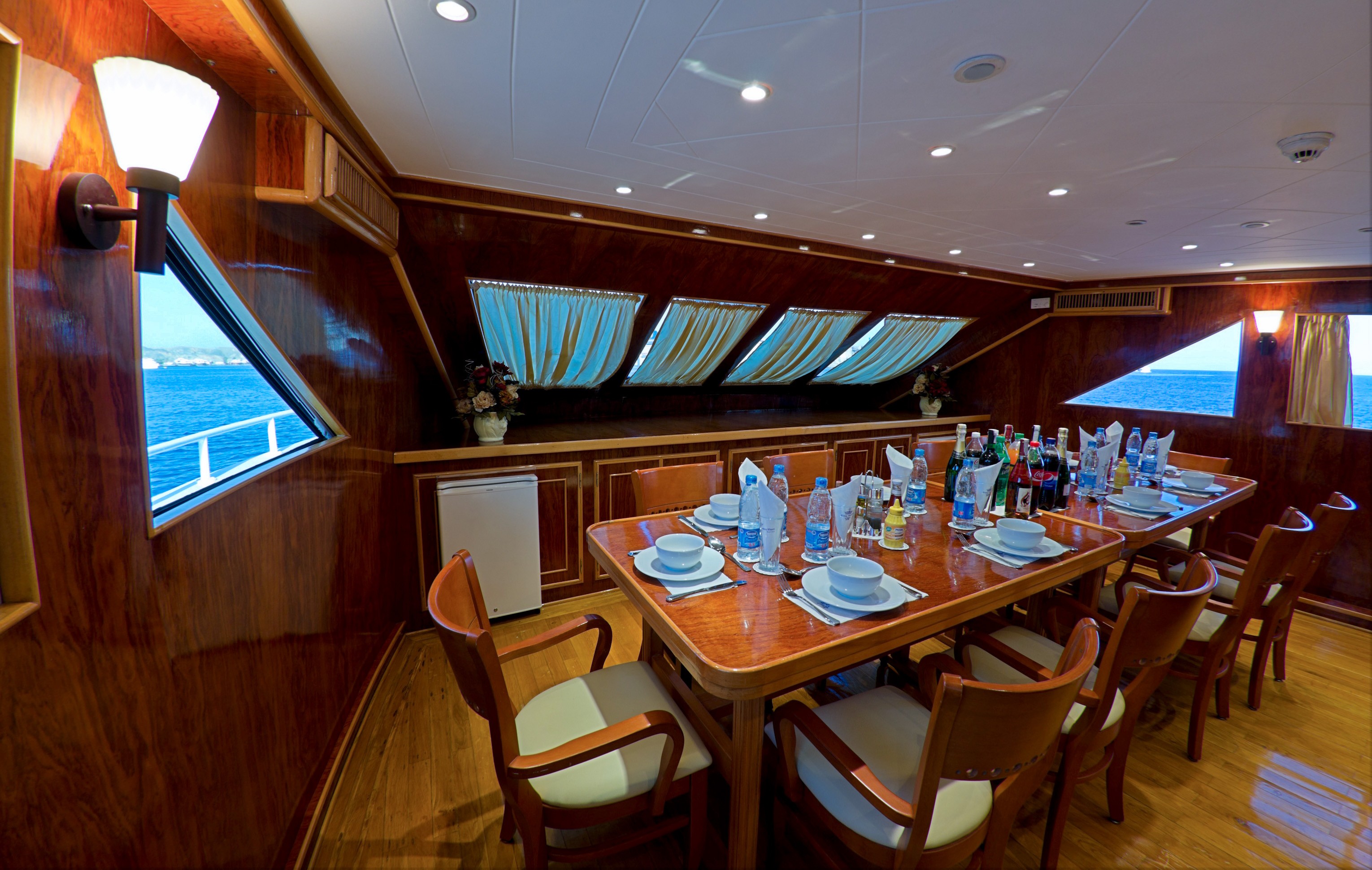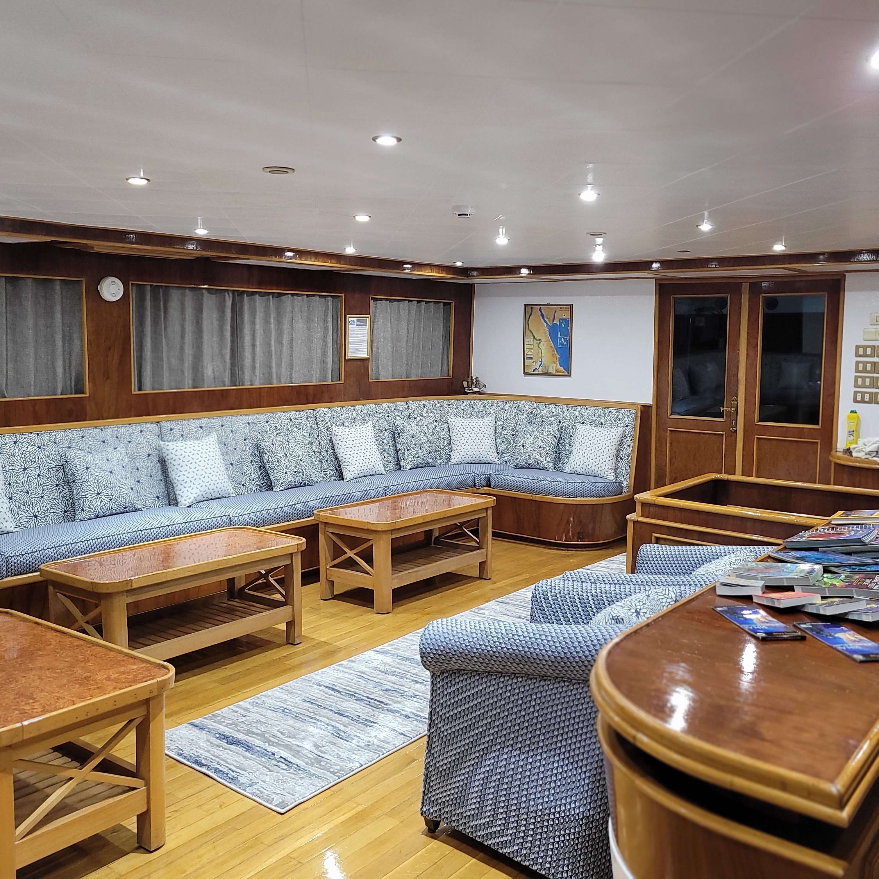 Sail from Sharm El Sheikh every Sunday and Wednesday on bespoke snorkeling and dolphin-watching charters. Enjoy panoramic sea views from the fine-wood dining room, unwind in the air-conditioned lounges, and toast the sunset from the open-air bar as the sea breeze carries your cares away.